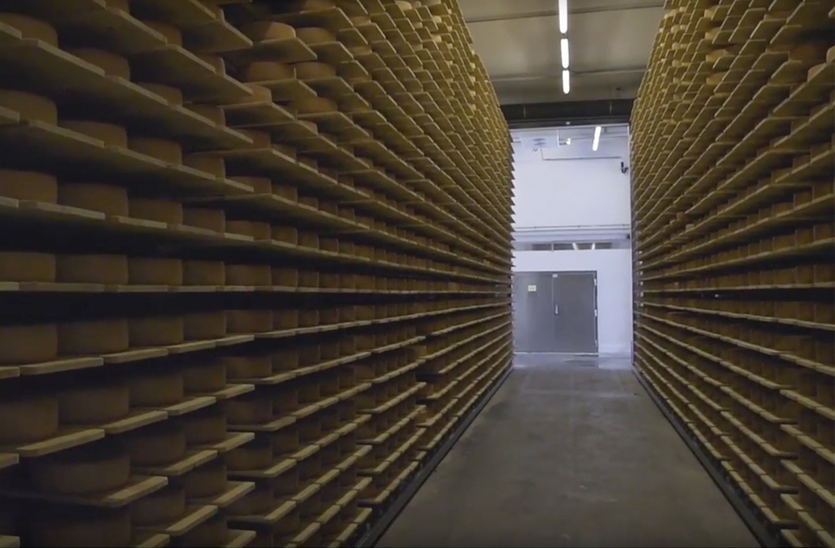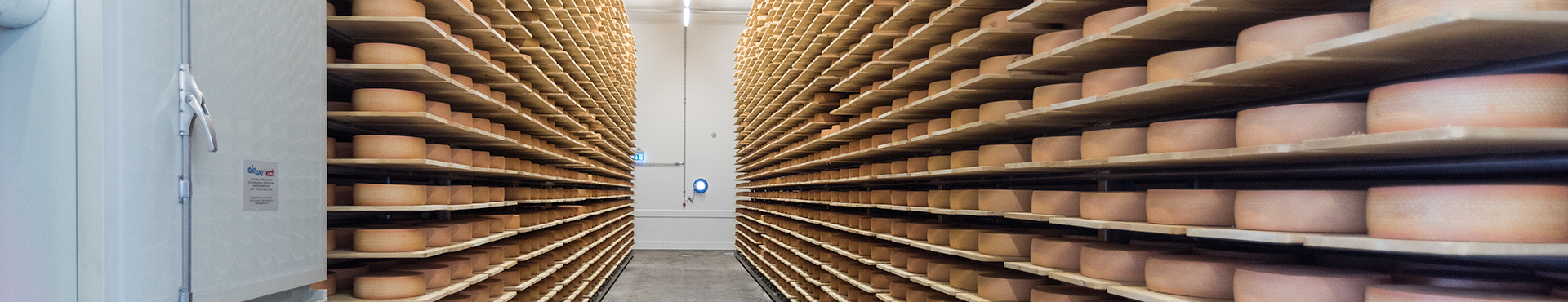 Unser Lager beinhaltet drei einzelne Reifezellen. Die Aufteilung der Käselaibe geschieht nach dem Reifegrad. Insgesamt finden in allen drei Reifezellen zusammen 30’000 Käselaibe Platz. Je nach Sorte reifen die Käselaibe zwischen 2 und 14 Monate lang. Sie werden wöchentlich 2 bis 3 Mal von zwei Pflegerobotern geschmiert und gewendet, bis sie den gewünschten Reifegrad erreicht haben.
